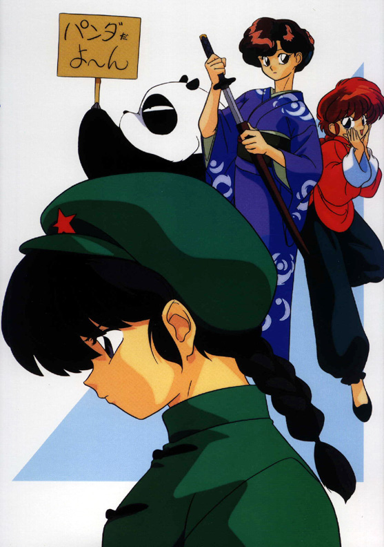 In queste due immagini ranma e' rappresentato assieme ad altri personaggi della serie... nella prima, assieme a suo padre (il panda) sua madre e se stesso in versione femminile, nella seconda, ranma abbraccia akane e sullo sfondo ci sono il suo maestro (il vecchietto), mousse (quello con gli occhiali) e il preside dela scuola (l' ultimo che rimane...)